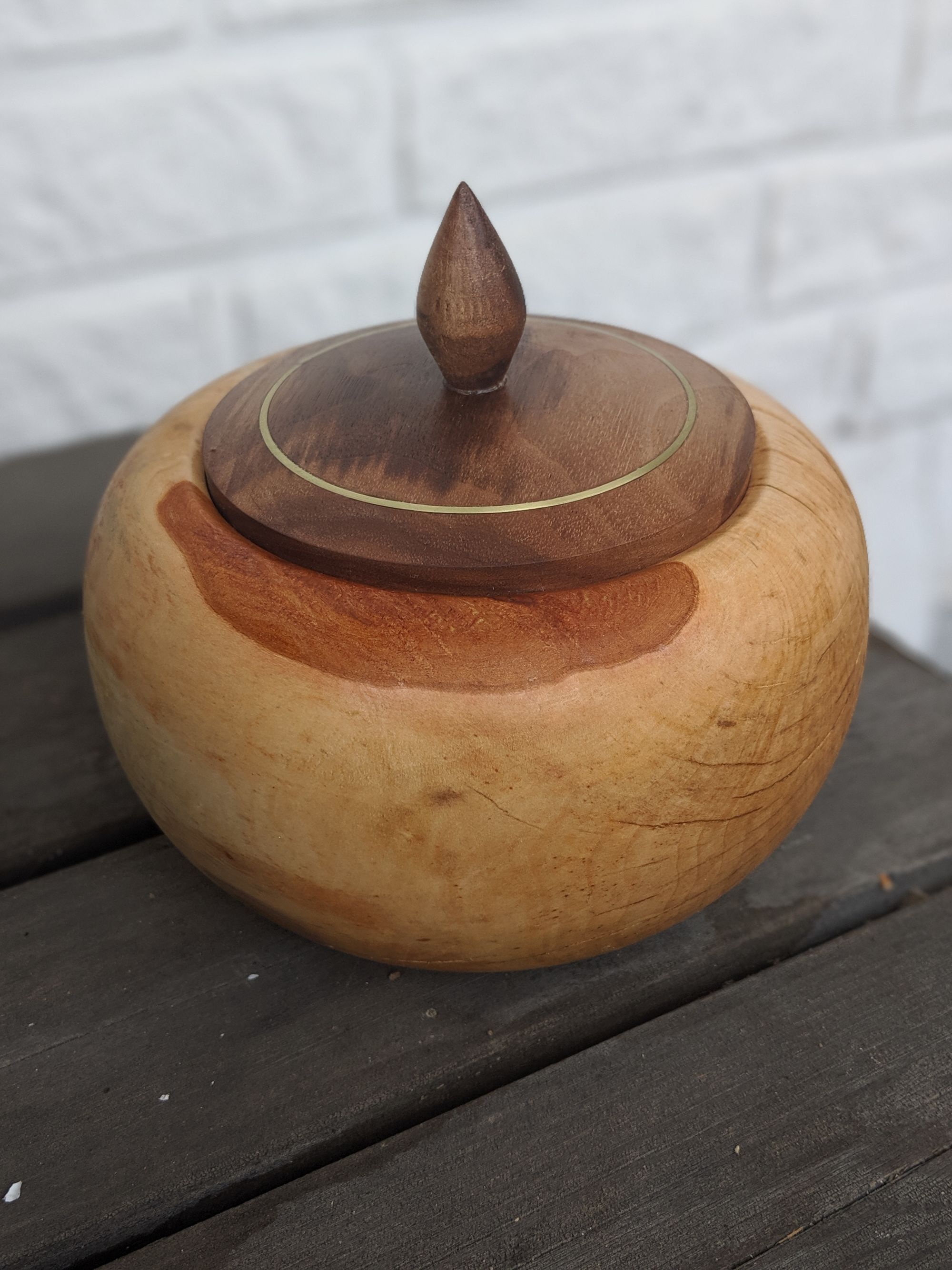 Base in oak and lid of walnut. Finish is a few layers of "Danish oil".