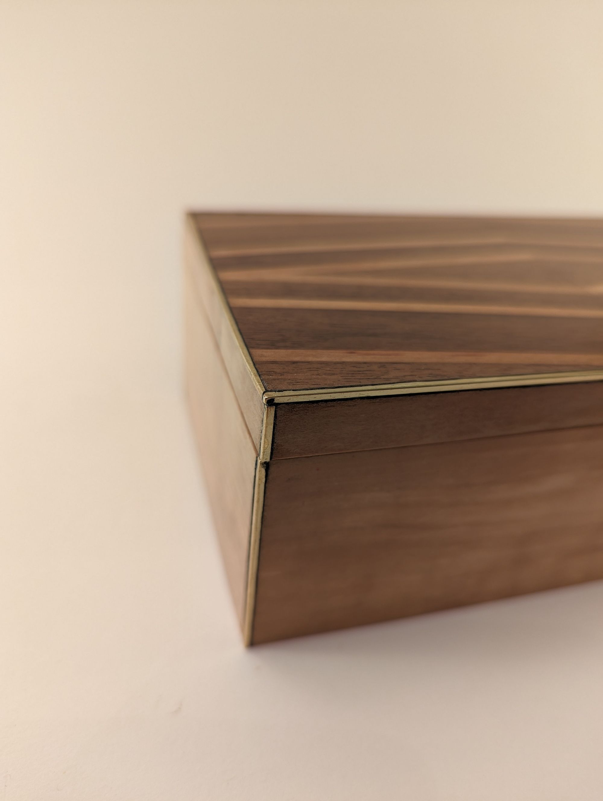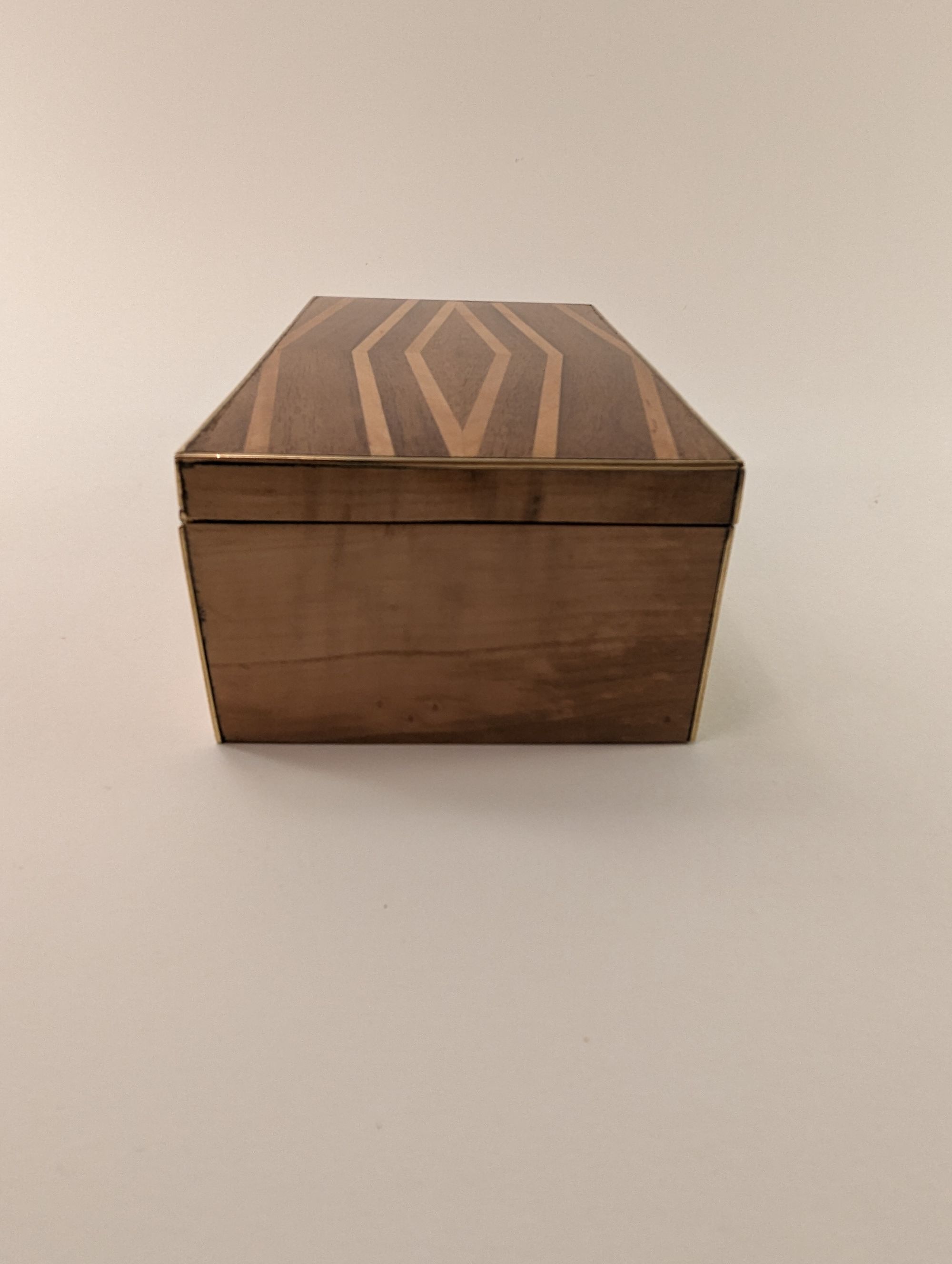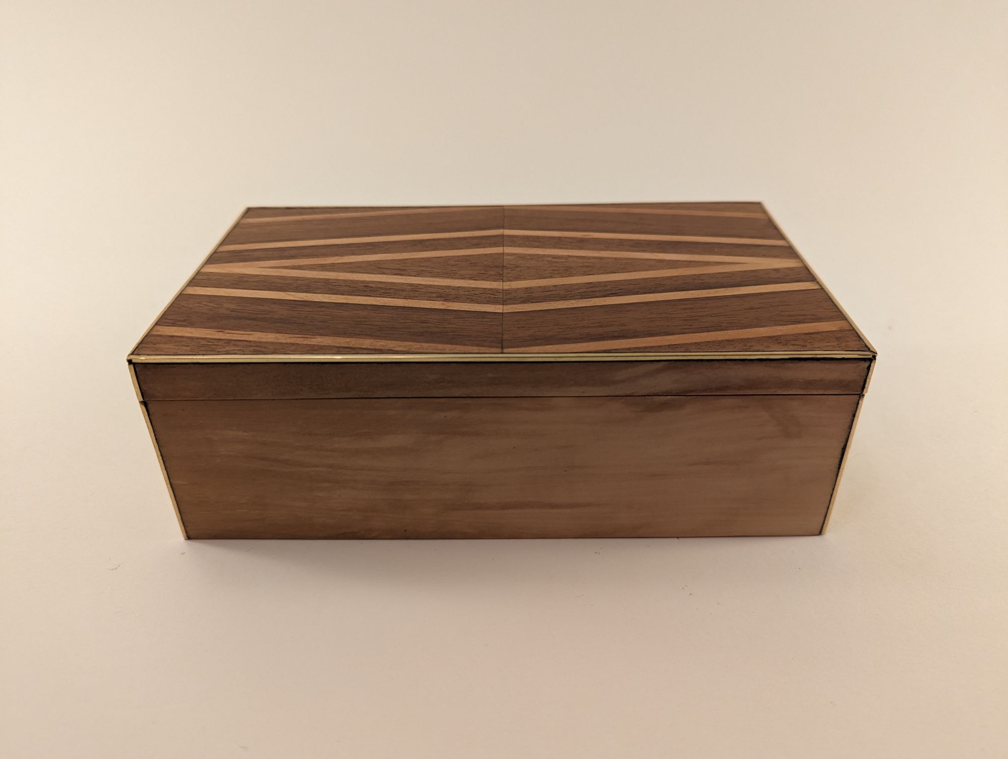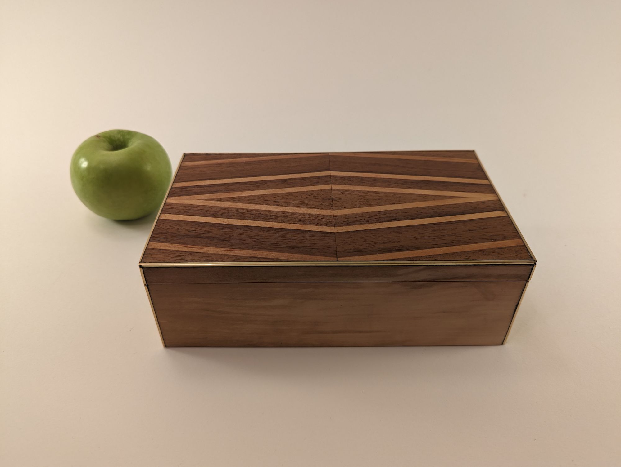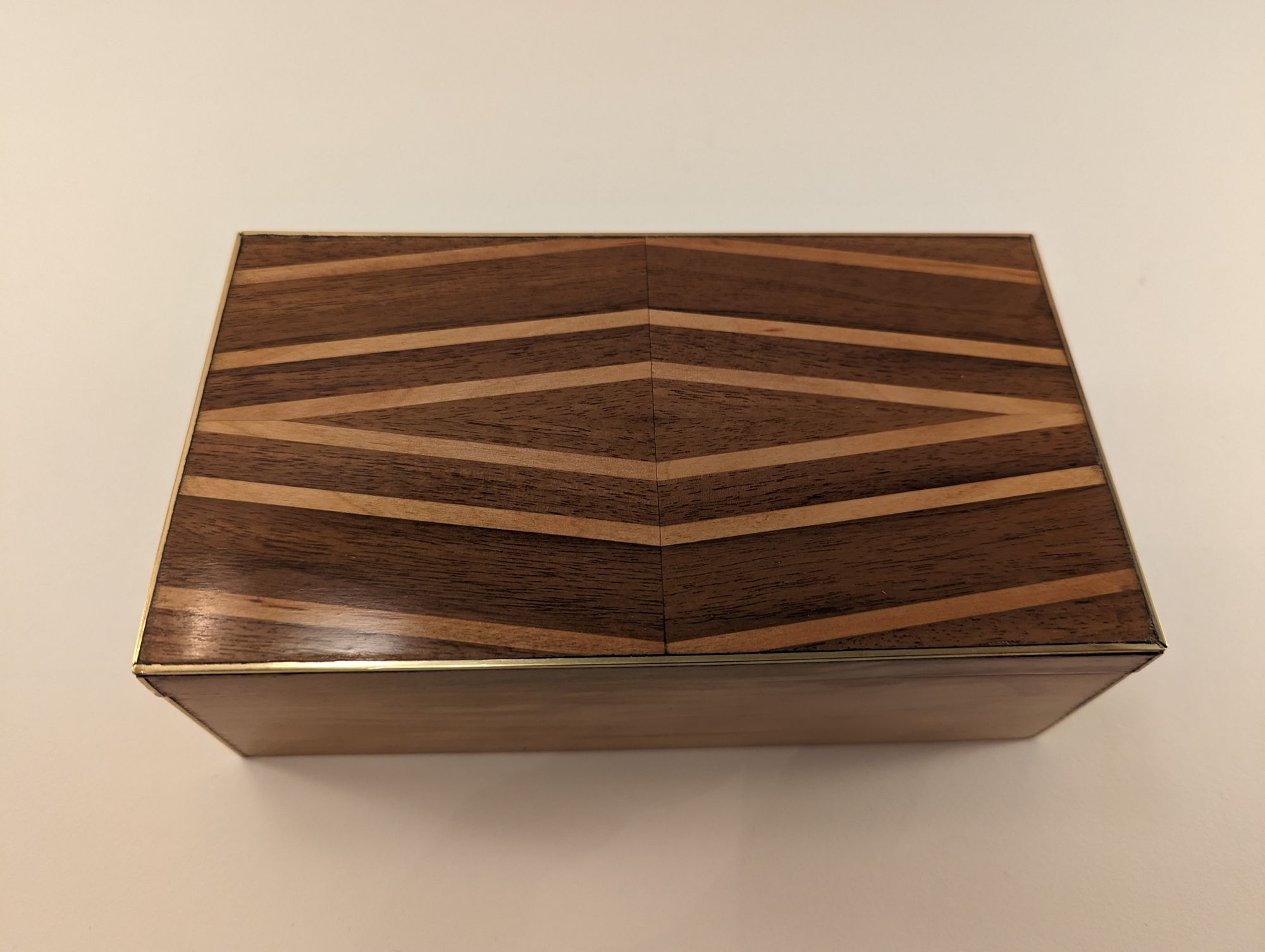 Walnut and maple top, pear wood for the sides, and brass inlay for the outer framing.