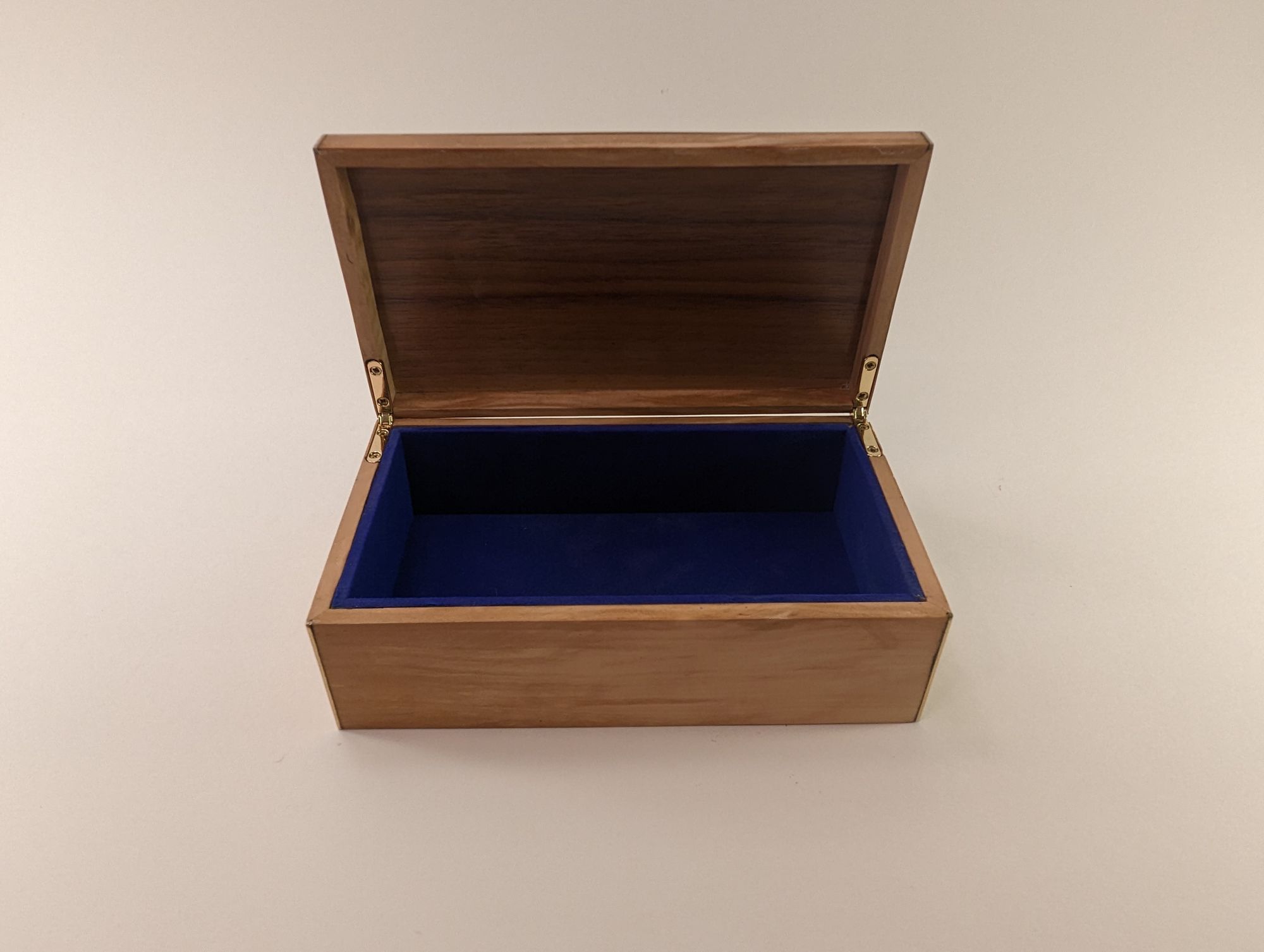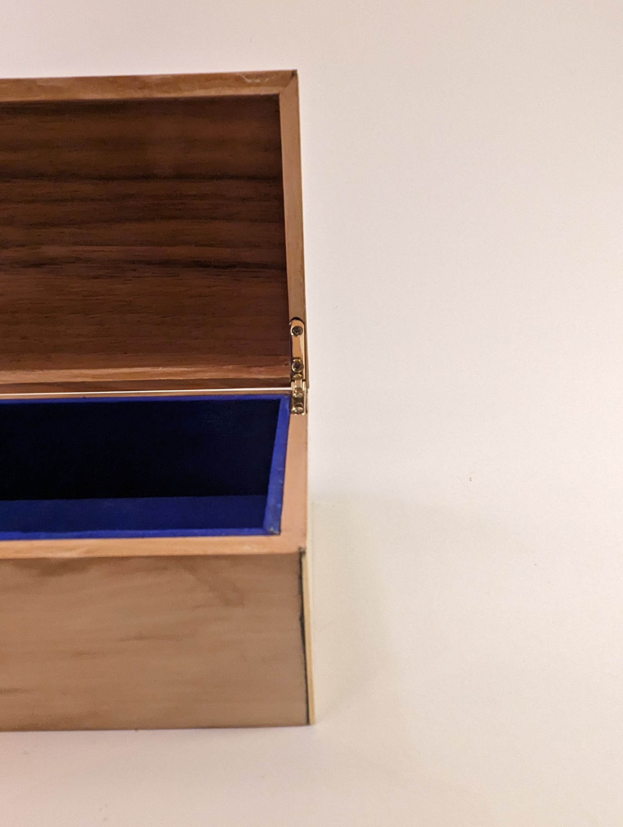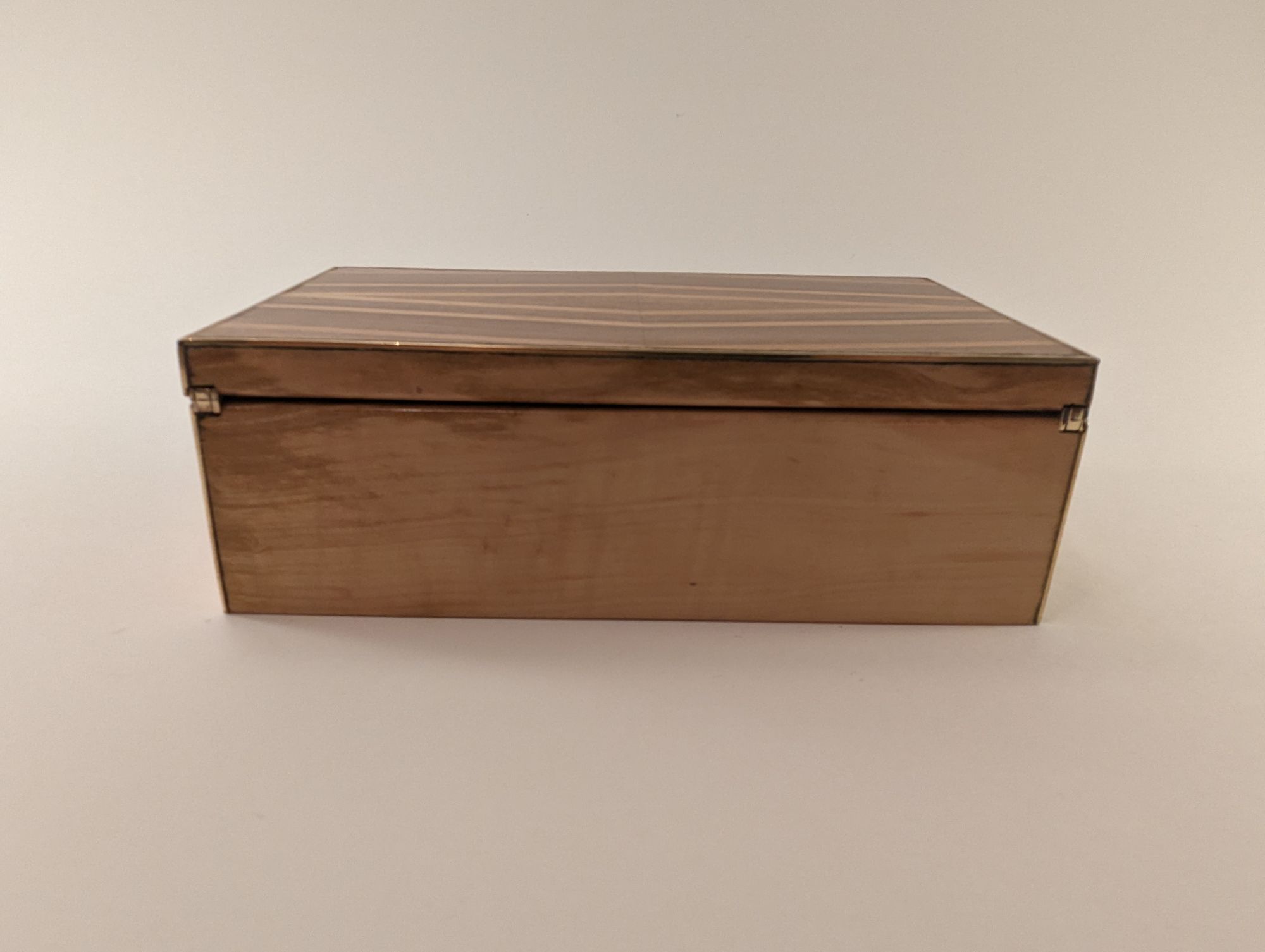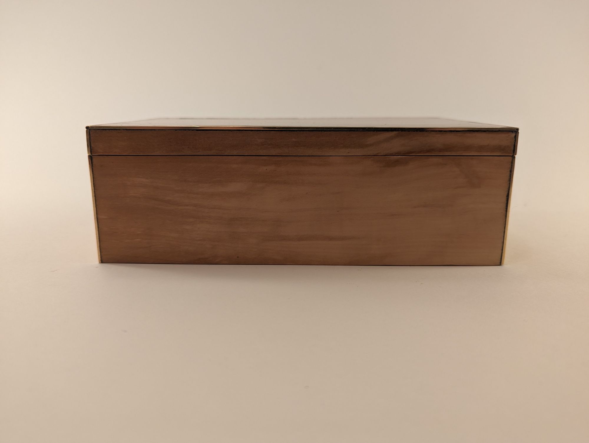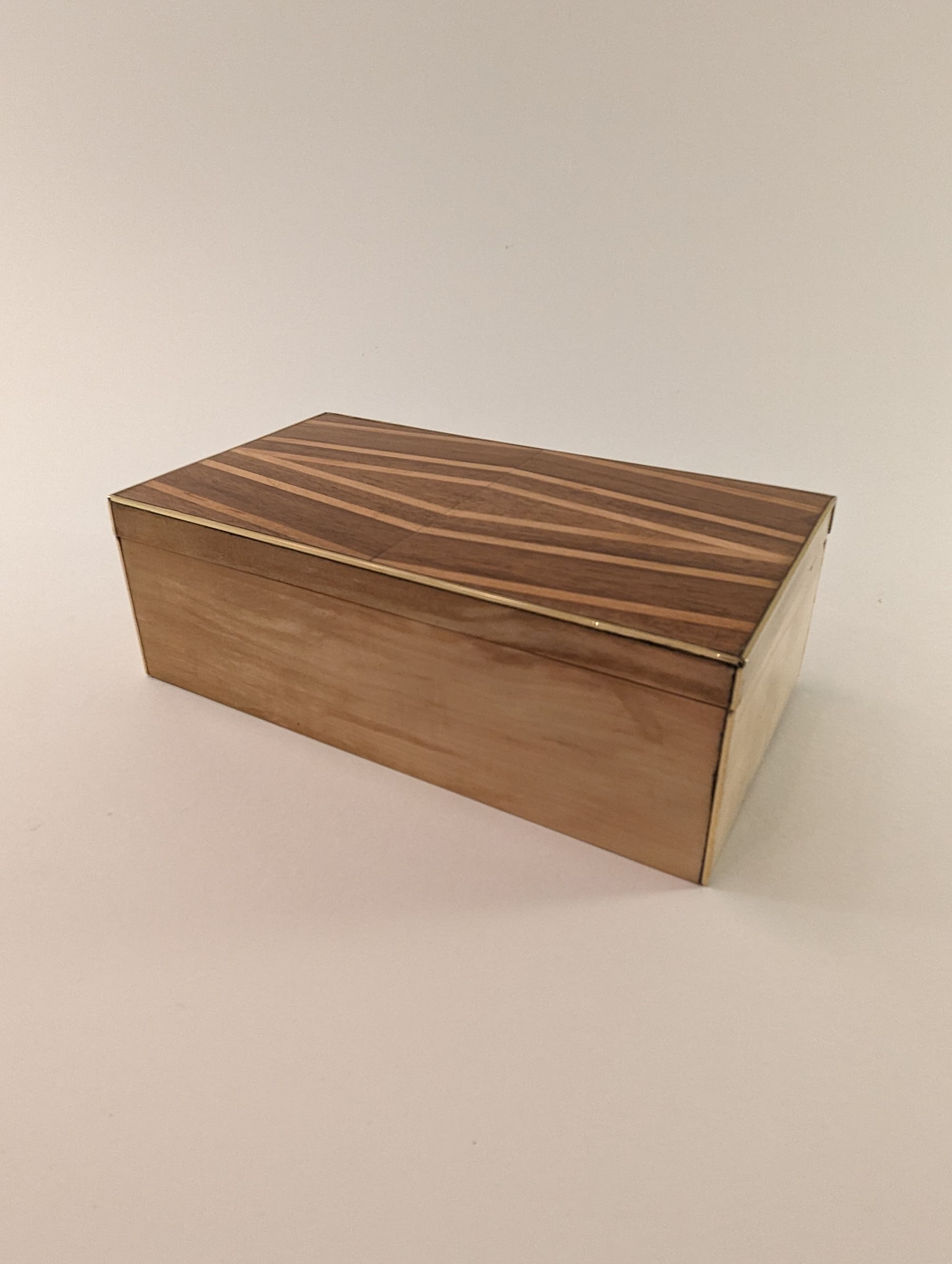 Walnut and maple top, pear wood for the sides, and brass inlay for the outer framing.