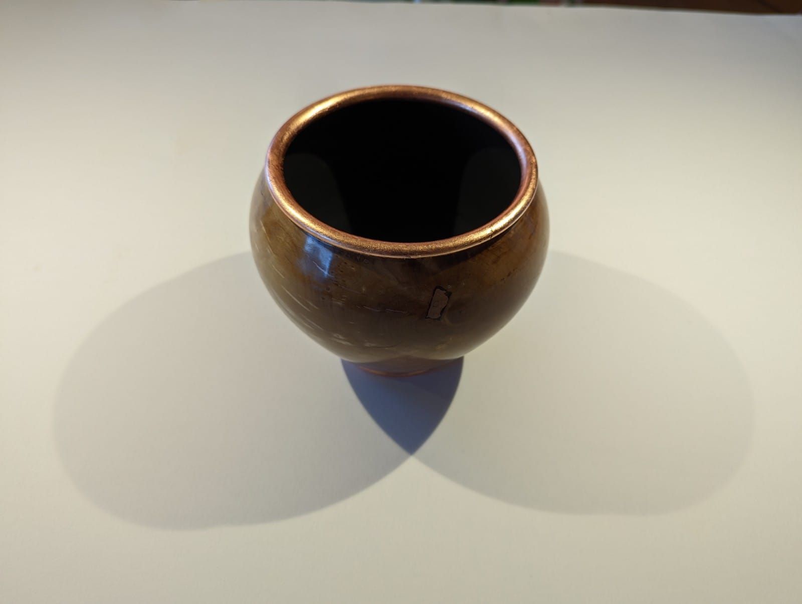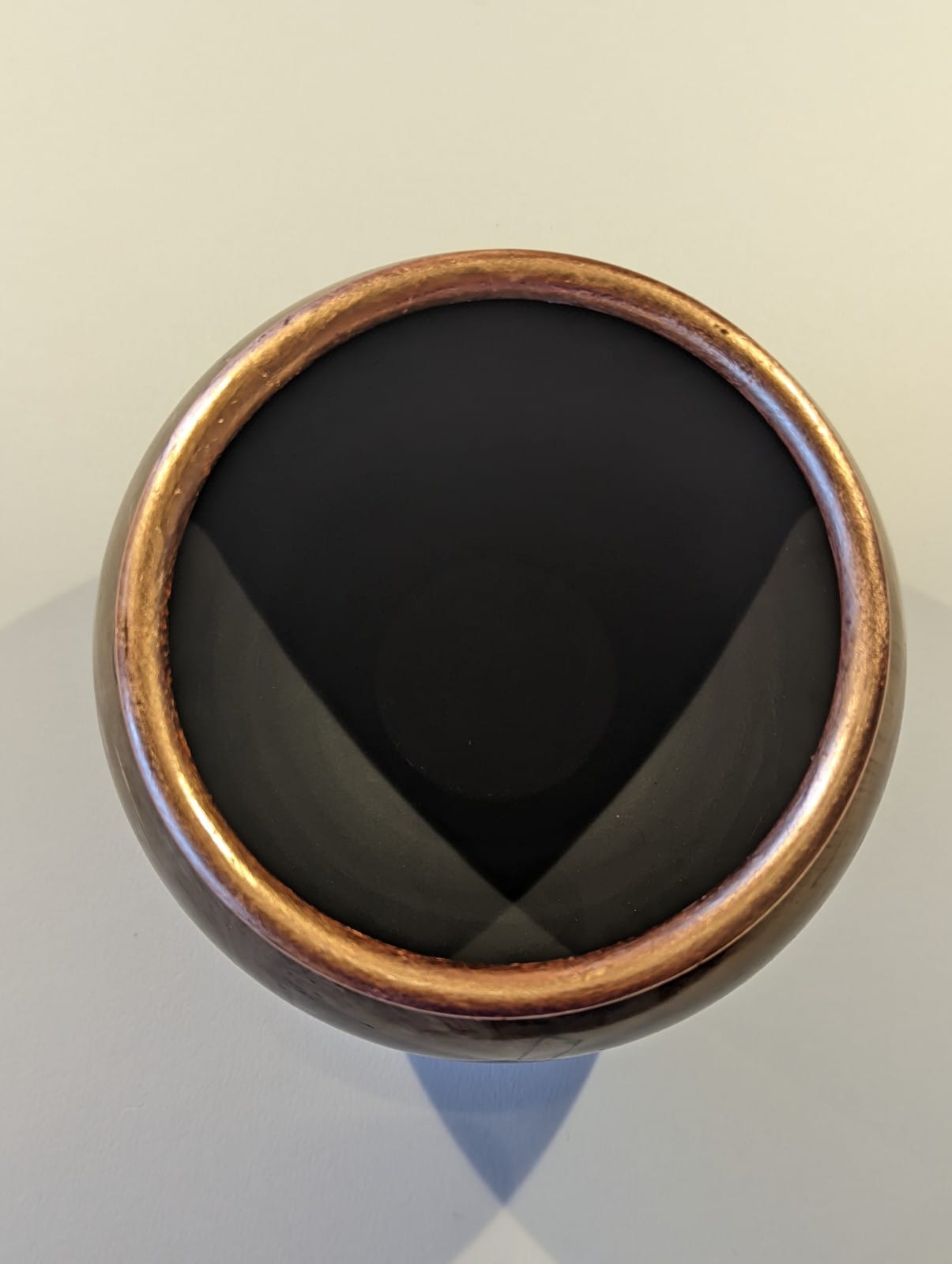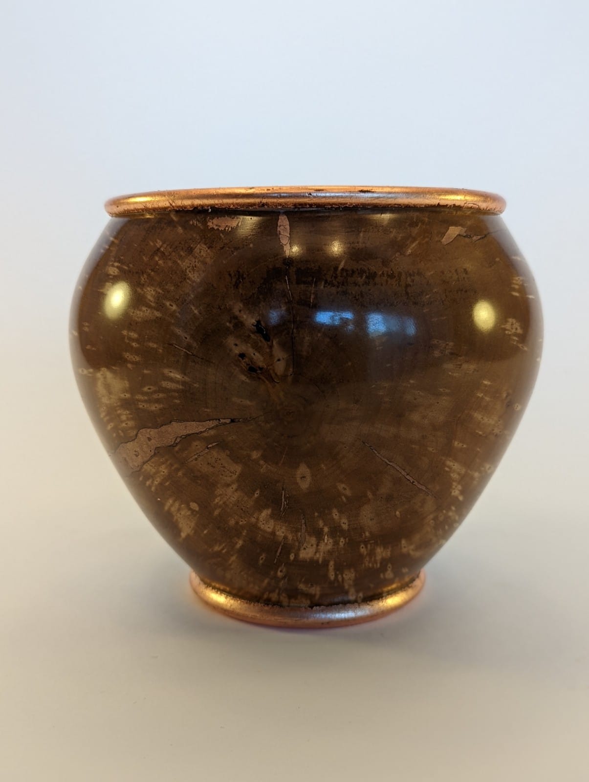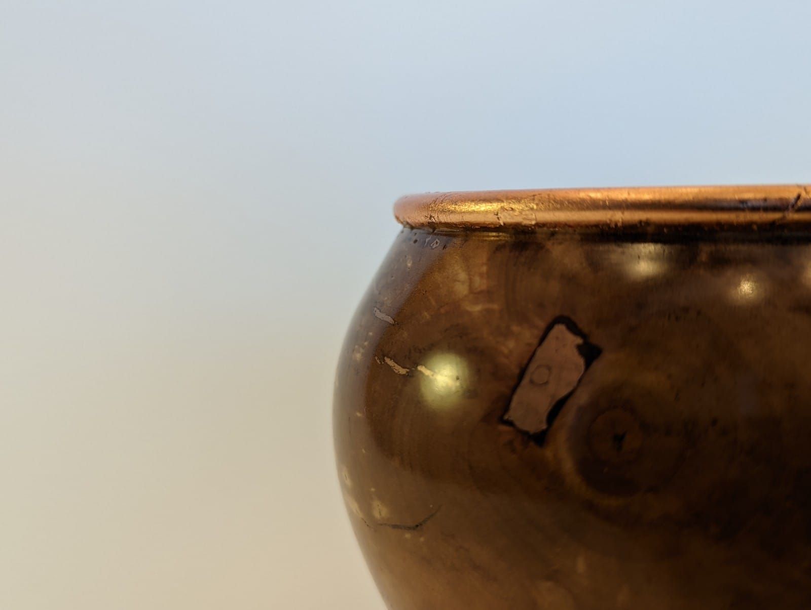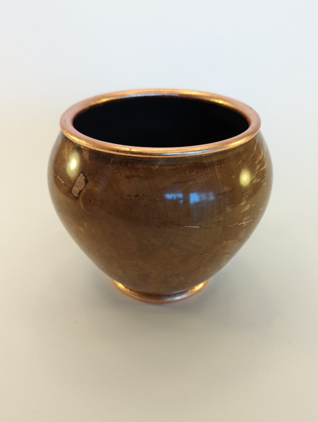 The wood was given to me a couple of years ago by my brother who had rescued it from a worse fate at the local bonfire. Cracks filled with copper and rims also gilded with copper. Inside painted with black chalk paint.