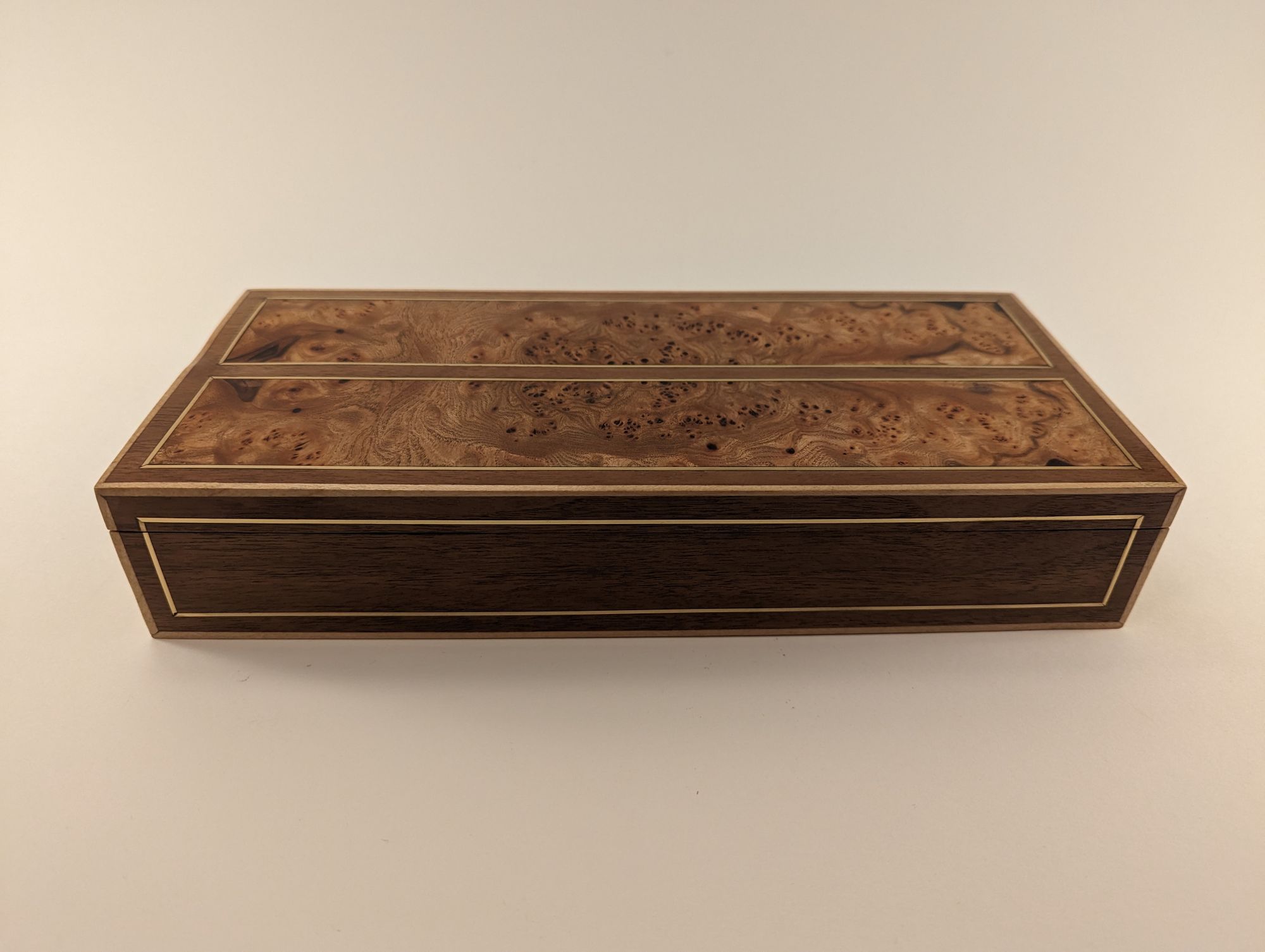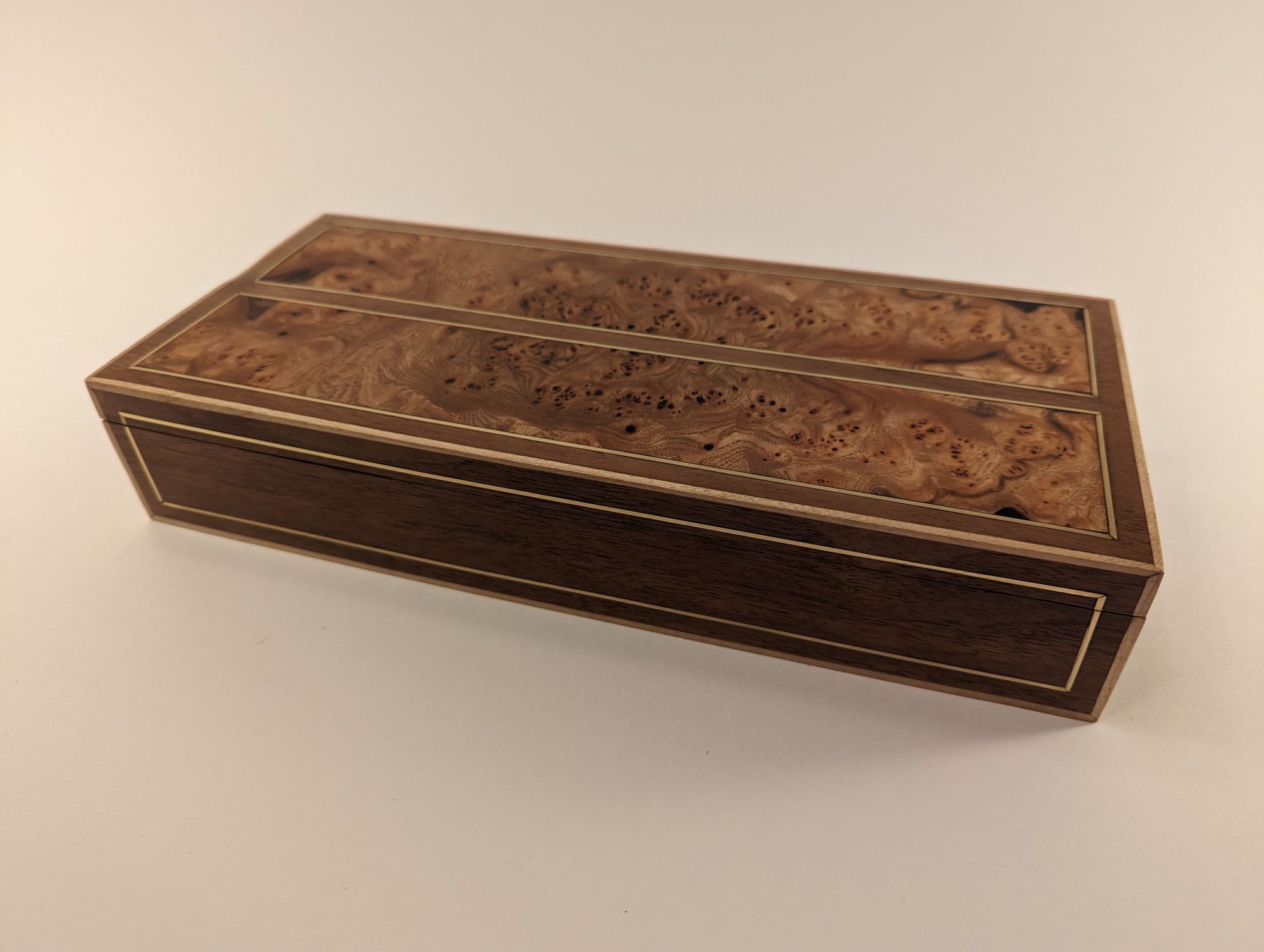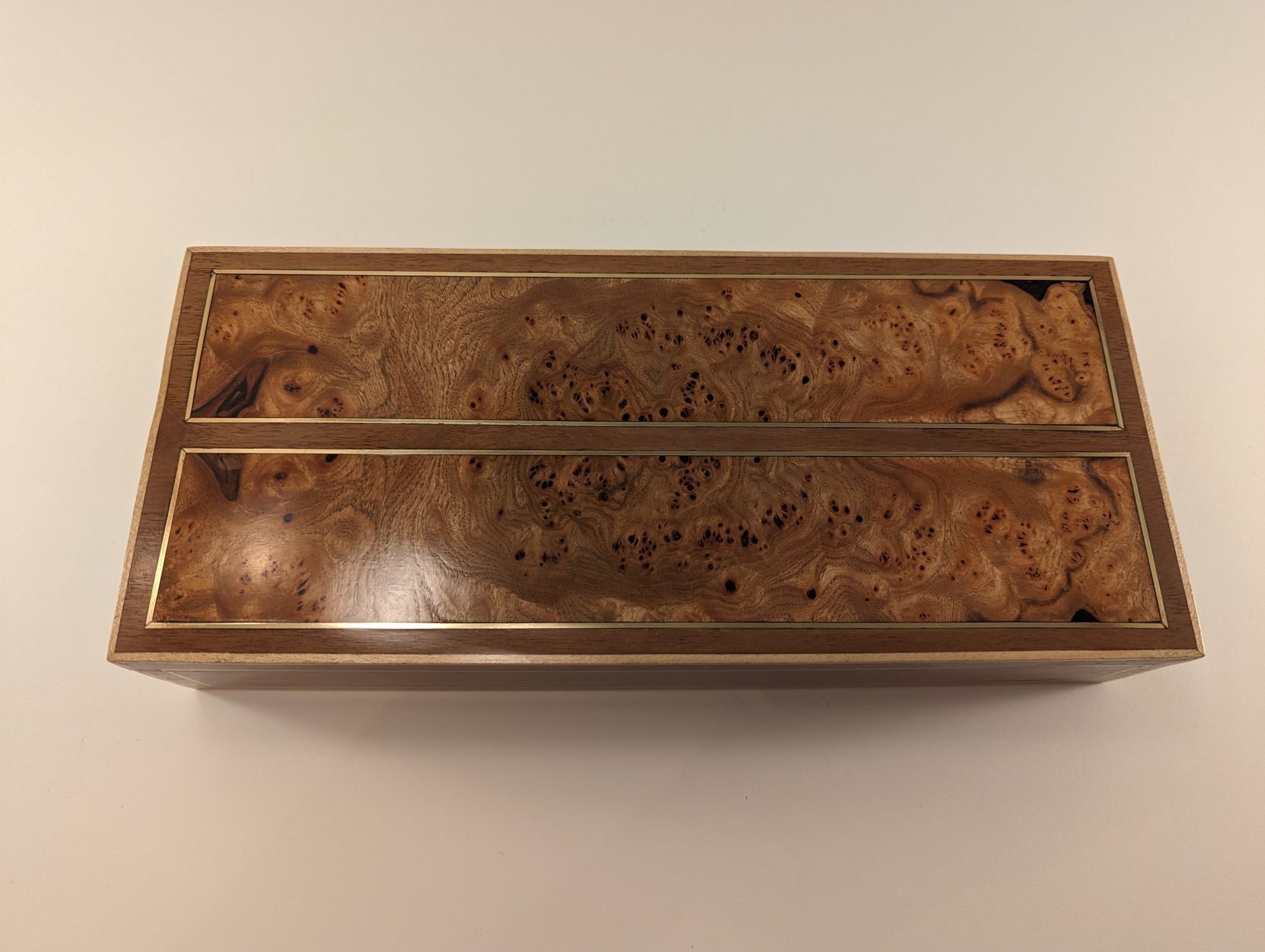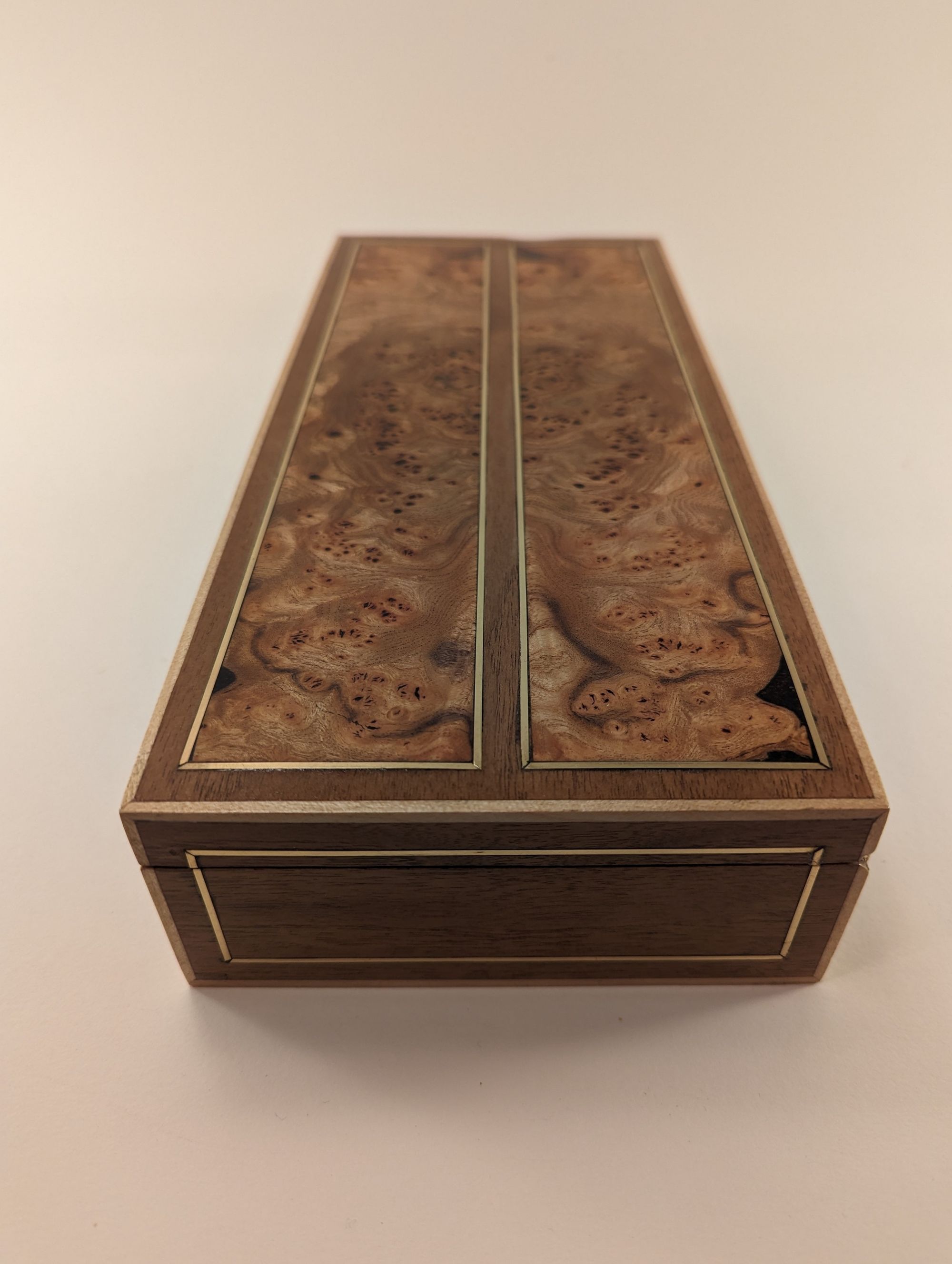 My best friend had a birthday and I had been planning on making him something. So I had these two pieces/panels of beautful patterned elm that I designed this box around. Lots of brass inlay to contrast with the walnut and maple strips on the outside for framing.