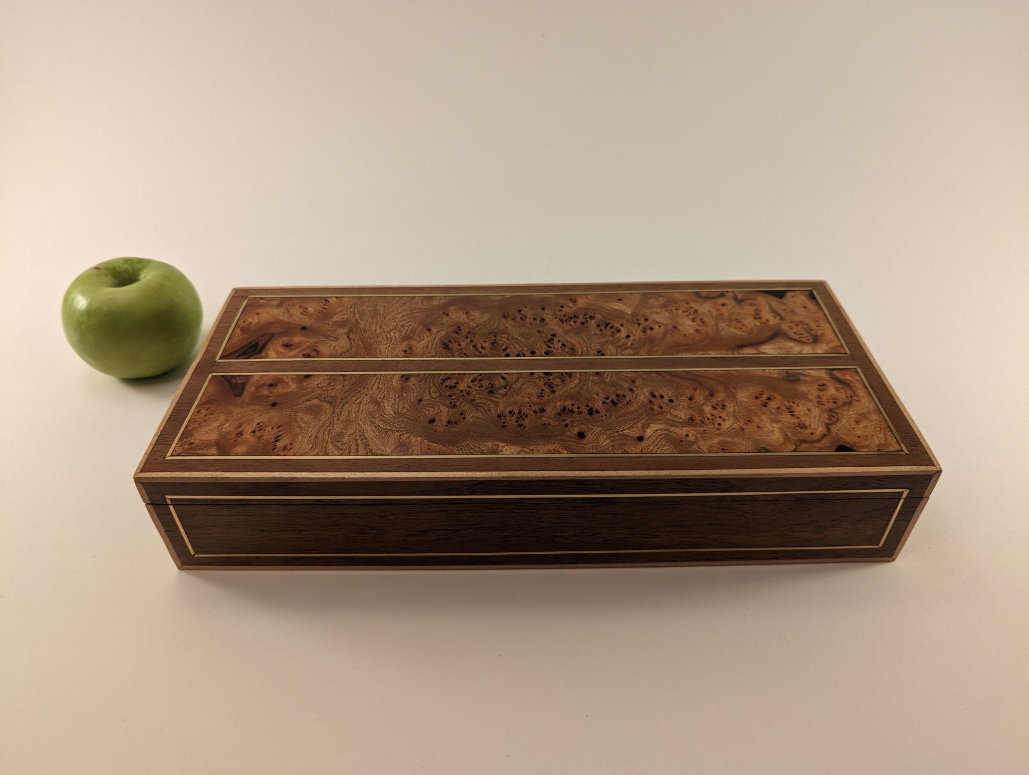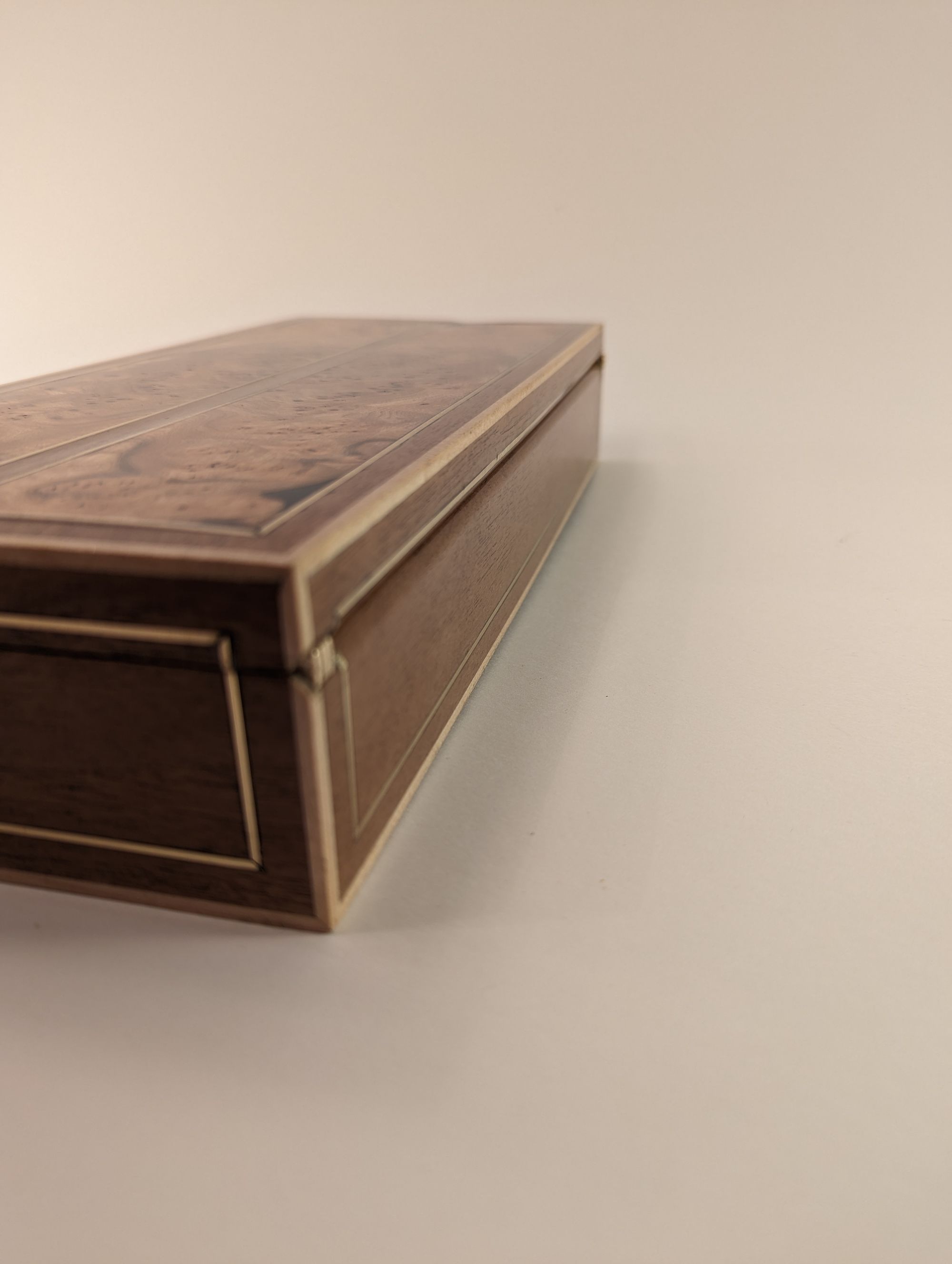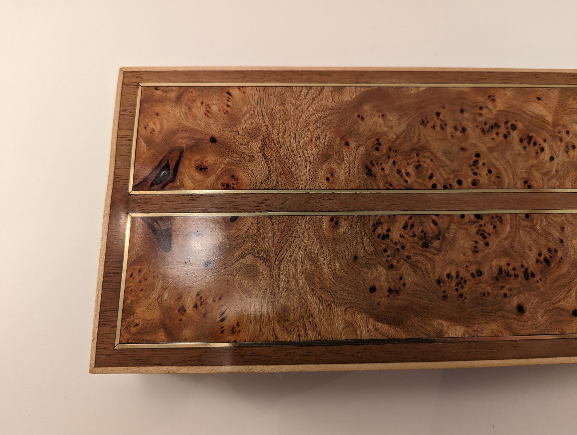 My best friend had a birthday and I had been planning on making him something. So I had these two pieces/panels of beautful patterned elm that I designed this box around. Lots of brass inlay to contrast with the walnut and maple strips on the outside for framing.