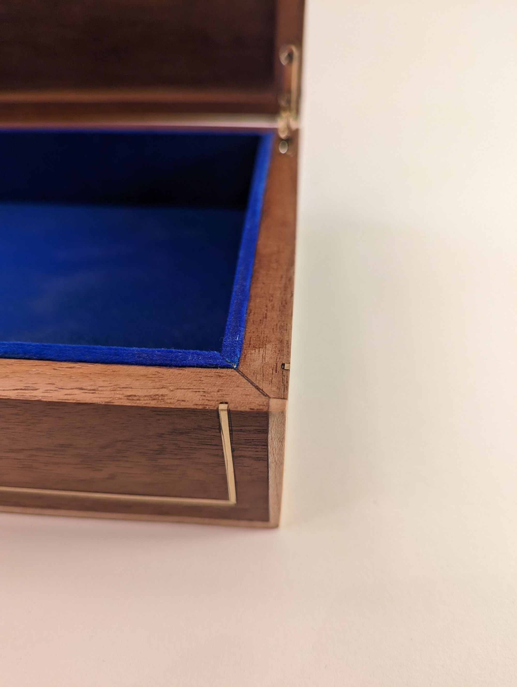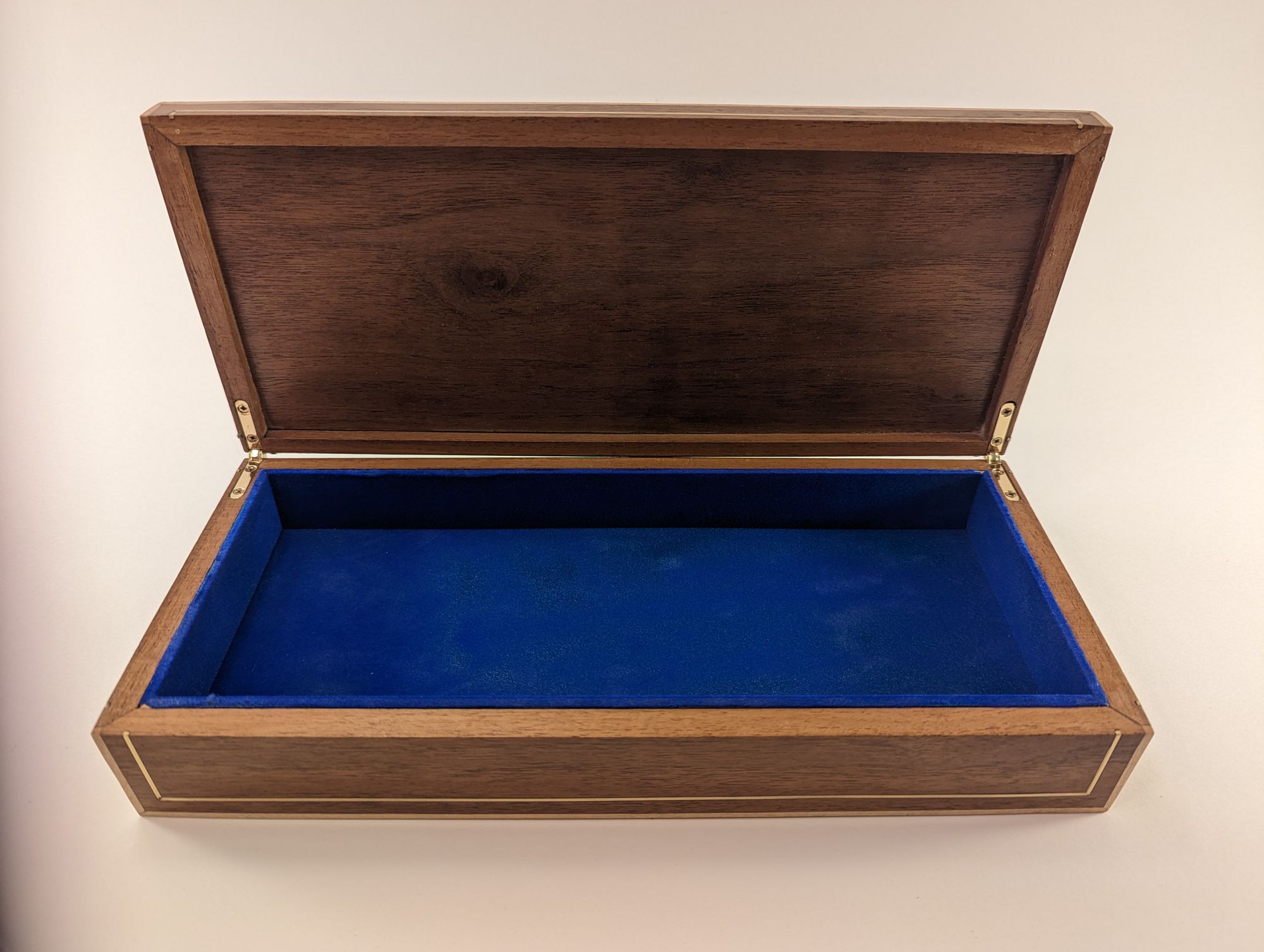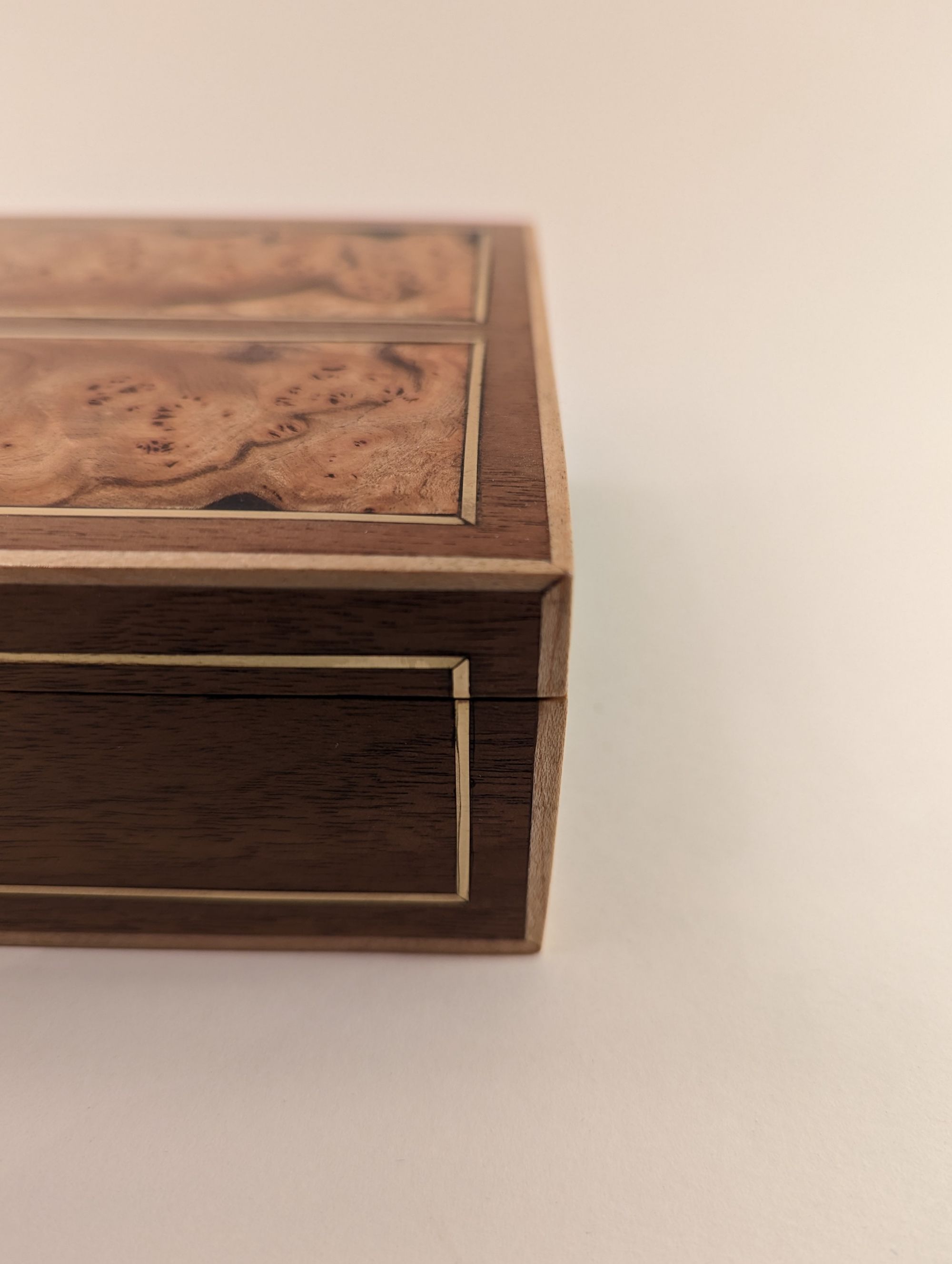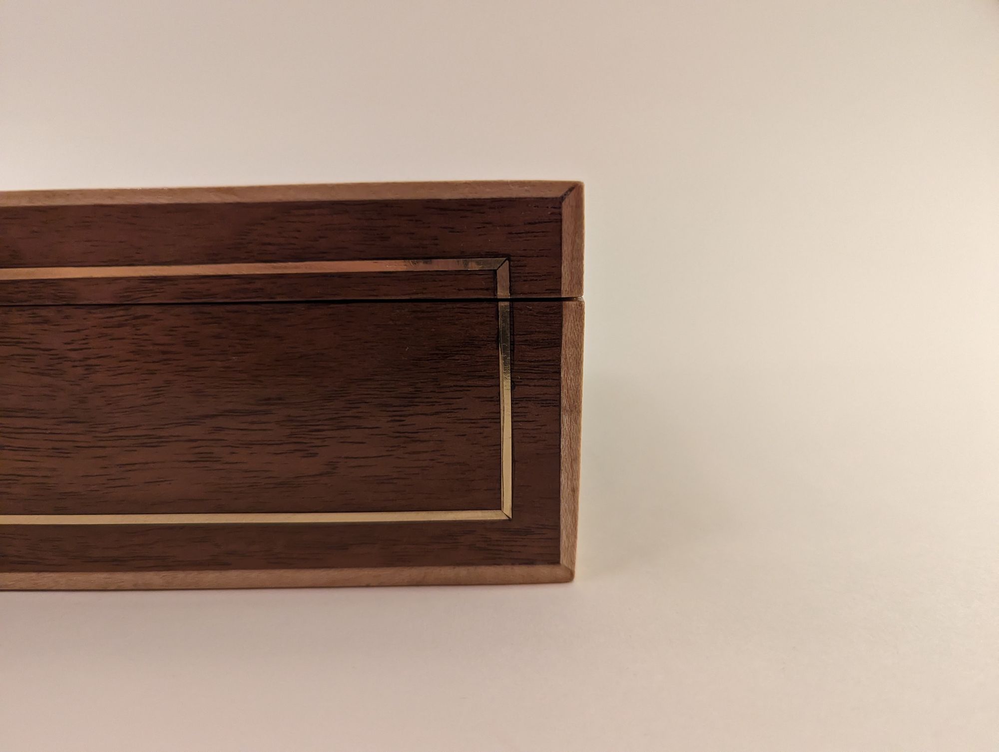My best friend had a birthday and I had been planning on making him something. So I had these two pieces/panels of beautful patterned elm that I designed this box around. Lots of brass inlay to contrast with the walnut and maple strips on the outside for framing.