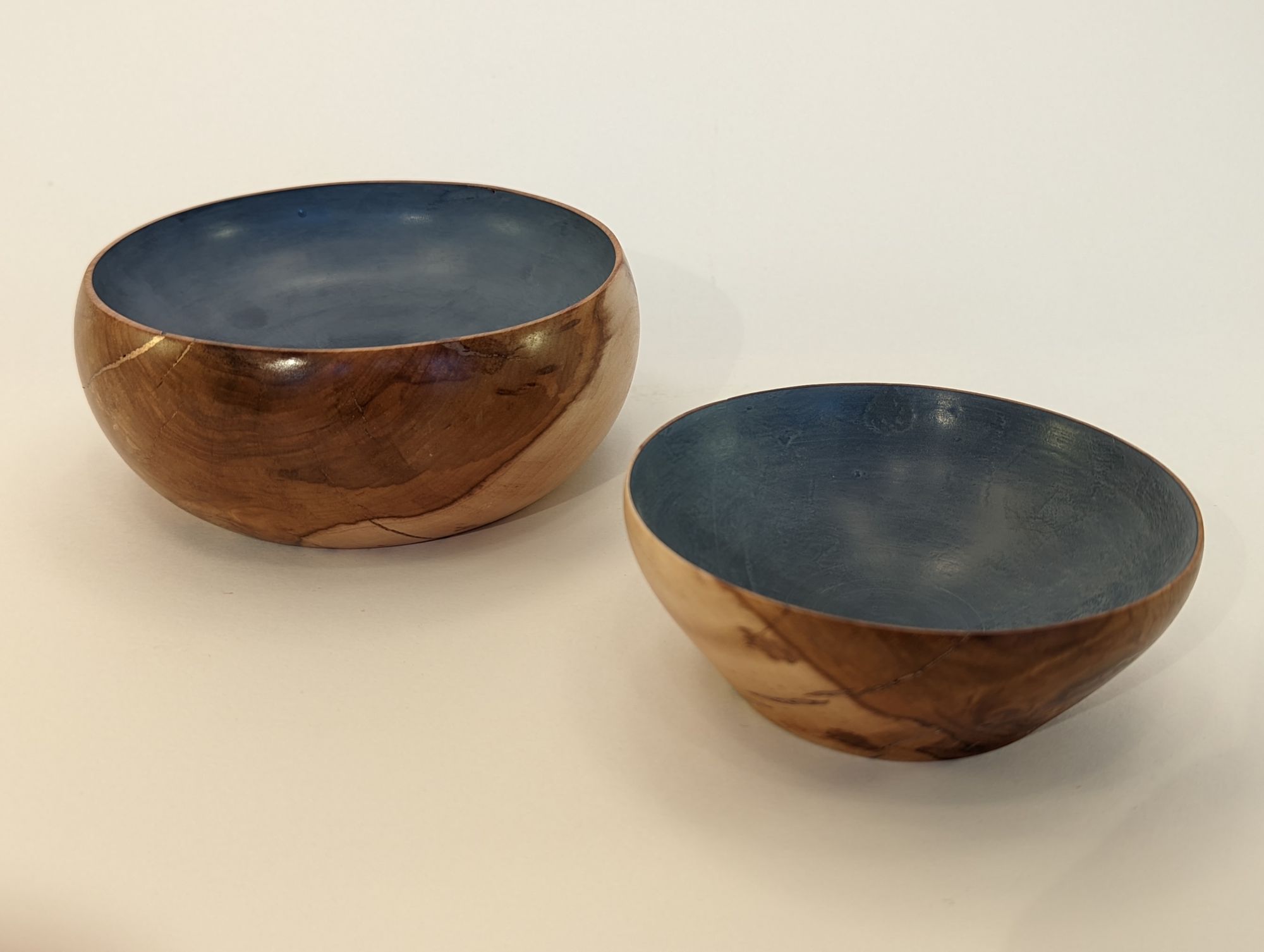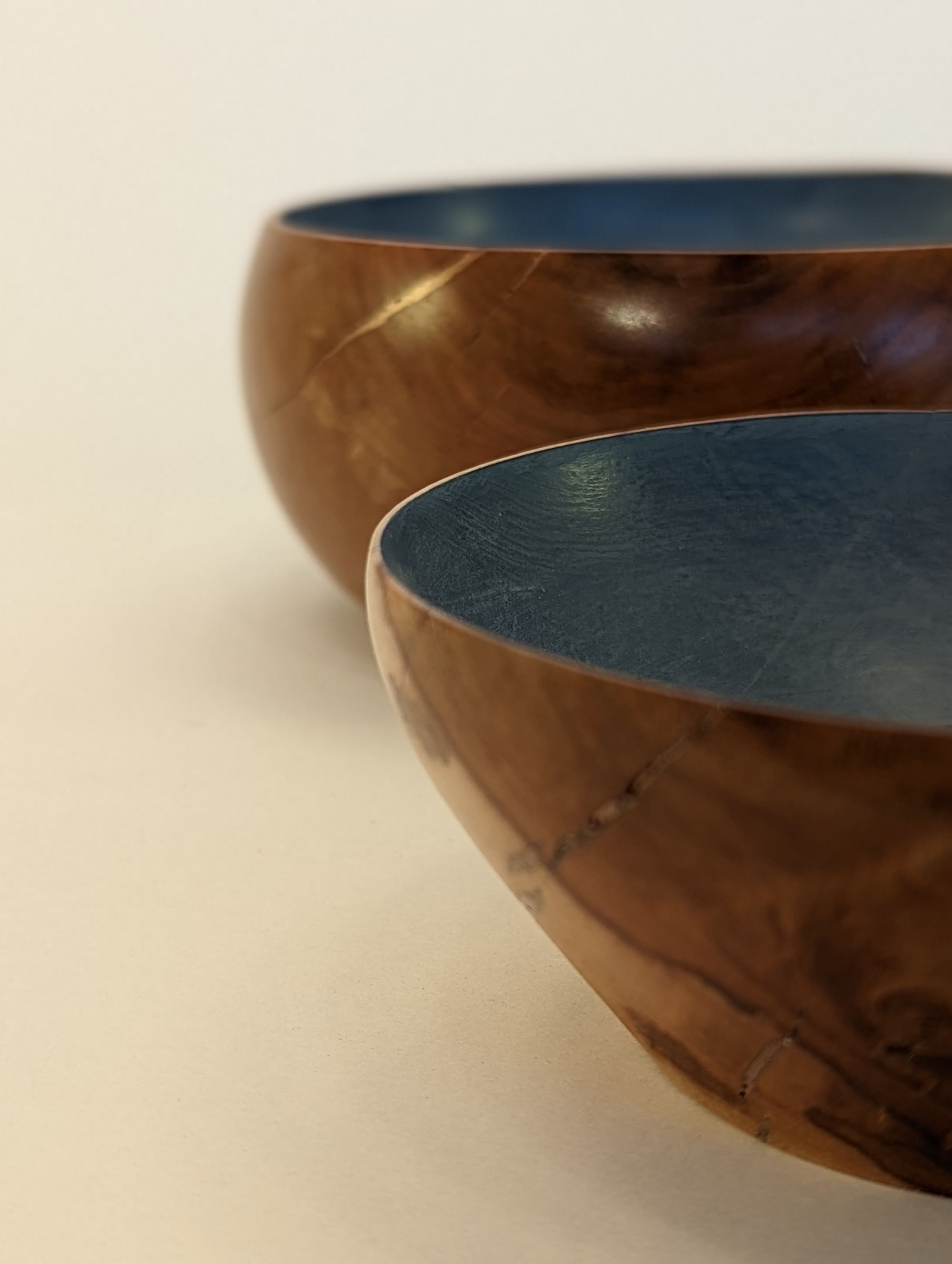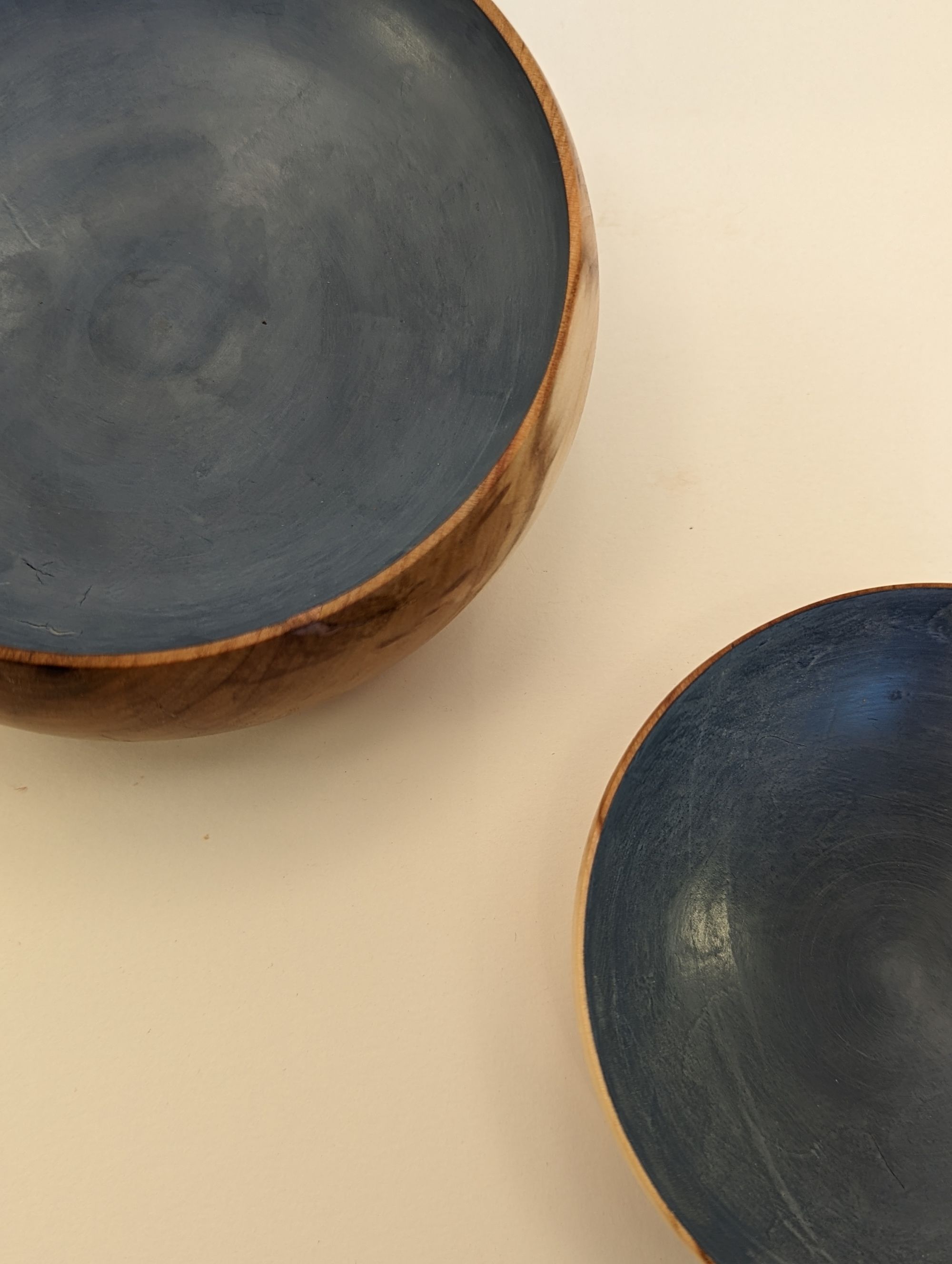 First time I've attempted (and had the patience for) making a couple of matching pieces. These bowl were made from apple tree and cracks were filled with copper inlay. Insides were then painted with chalk paint which was also a first.
